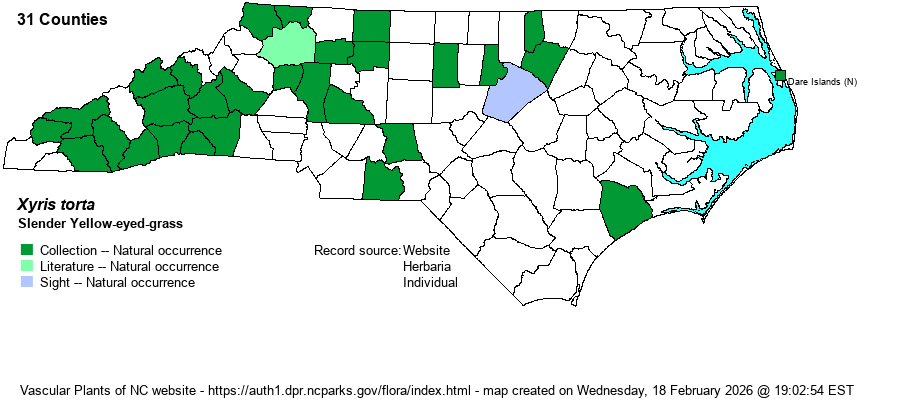 | Distribution | Mountains and Piedmont; disjunct to Onslow County (no specific location) and to Dare County (Nags Head Woods). The only NC member of the genus essentially limited to the Piedmont and Mountains; all other Xyris are strictly or nearly limited to the Coastal Plain and Sandhills.
