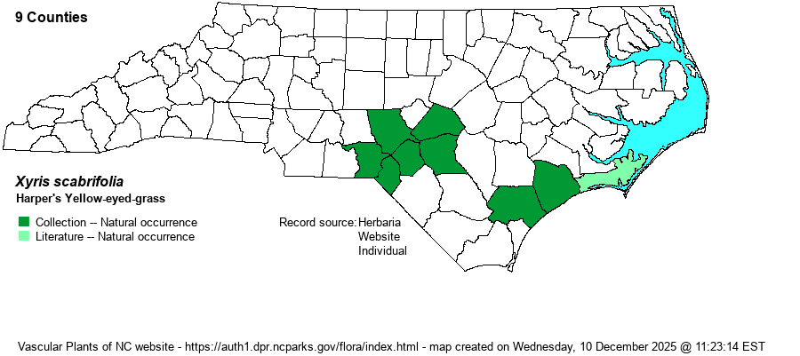 | Xyris scabrifolia | < | Xyris scabrifolia | Flora of North America (1993b, 1997, 2000, 2002a, 2002b, 2003a, 2004b, 2005, 2006a, 2006b, 2006c, 2007a, 2009, 2010) | | | Xyris scabrifolia | < | Xyris scabrifolia | Kartesz (1999) | | | Xyris scabrifolia | < | Xyris scabrifolia | Kral in Kubitzki (1998b). Key adapted from X, GW, and Z. | (also see X. chapmanii) | | Source: Weakley's Flora |
