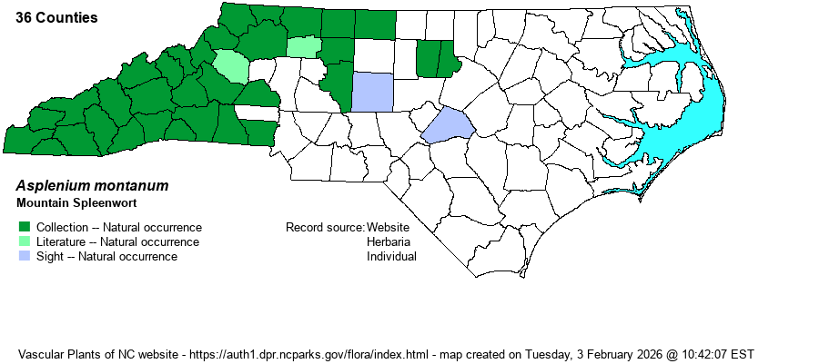 | Distribution | Throughout the Mountains; present at most of the western Piedmont ranges and isolated monadnocks, but widely scattered only eastward in that province, extending to Durham and Harnett counties (Raven Rock SP).