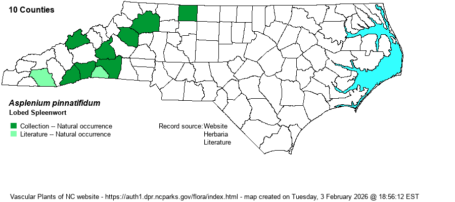| Identification | This is an oddly shaped fern, looking halfway between the lacy A. montanum and the lance-shaped A. rhizophyllum -- in fact, it indeed is a fertile allotetraploid species derived from the hybridization of these two species. Several fronds grow in a clump, with the usually dark brown stipe about 3-4 inches long, and a narrowly triangular blade about 7-8 inches long but barely 1 inch wide at the base. The evergreen blade is clearly pinnate-divided along the basal third to half of the blade, but the more distal half has the pinnae extremely short and barely just slight lobes along the rachis, with the distal end being very long and extremely slender. These lower pinnae are opposite and somewhat rounded in shape. There are several sori under each pinna, arranged diagonally to the midrib. Though Weakley (2018) does not list varieties, this species can be somewhat variable in blade shape; thus, you may find plants that do not look halfway between A. montanum and A. rhizophyllum in blade shape. | |