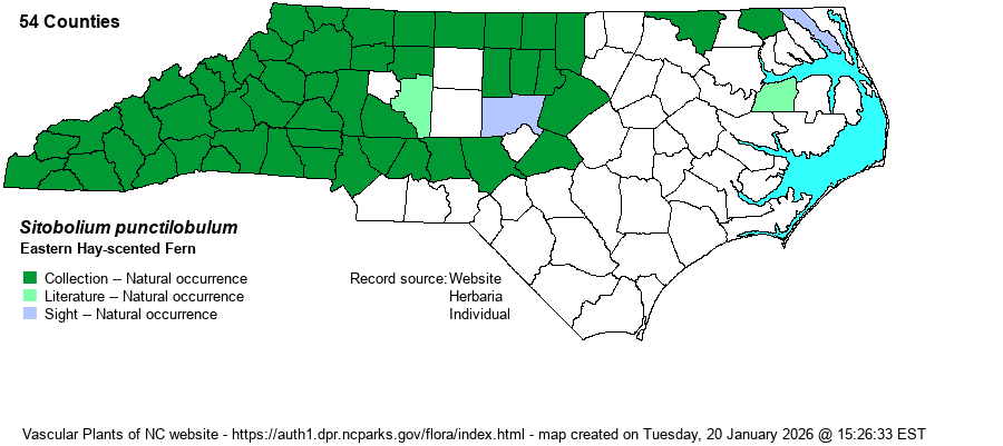| Identification | This is a typical-looking fern, with a frond about 2-2.5 feet tall. The petiole is reddish-brown at the base but mostly yellow-green. The blade is ovate to lanceolate, with 17-25 pairs of pinnae, and the blade is bi-pinnately divided, and the pinnules are pinnatifid (nearly cut to the base). This yields a very lacy-cut frond, with the lowest pinnae about equal in size. The frond has a scent of freshly-cut hay (hence the common name), but you may need the sori on the underside of the pinnae to be certain you have this species. The sori are solitary and marginal, along the edge of a pinnule. The Athyrium species (lady-ferns) are similar in the frond, but the sori beneath the frond are somewhat elongate (not rounded) and located along the veins near the midrib of a pinnule. If sori are not present, you could have trouble clinching the identification, though Weakley (2018) states that the species "can be distinguished from other woodland ferns with deciduous fronds of generally similar size and shape (such as Athyrium, Dryopteris, and Parathelypteris) by the following characteristics: leaves yellow-green or pale green in color, with whitish-gray glandular trichomes, petioles silvery-pilose, leaves borne scattered (as clonal patches), sori tiny (<0.5 mm in diameter)". | |