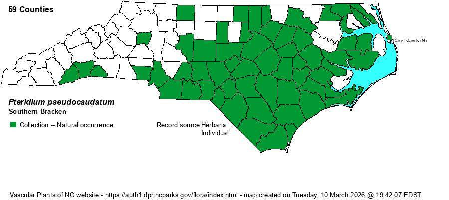 | Distribution | The long-used name Pteridium aquilinum has been split recently, such that that name is now reserved for Eurasian and other Old World plants. North American plants are now P. latiusculum and P. pseudocaudatum. The former occurs mostly in the Mountains and Piedmont, while the latter occurs mainly in the Coastal Plain and Piedmont. Although a few herbaria do seem to have re-examined at least some of their specimens, and the SERNEC database contains a handful of specimens labeled as P. pseudocaudatum, the editors believe that mapping such incomplete data would be misleading at the present time. However, Sorrie extracted distribution data from NCU specimens in Jan. 2024.