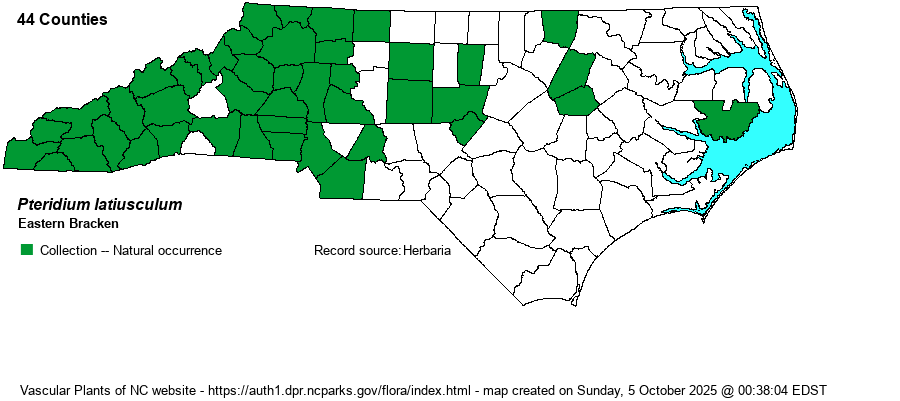 Distribution | The long-used name Pteridium aquilinum has been split in recent years, with that name reserved for Eurasian, African, etc. plants. North American plants are now P. latiusculum and P. pseudocaudatum. Weakley (2018) shows that the former occurs mostly in the Mountains and Piedmont, while the latter occurs mainly in the Piedmont and Coastal Plain. Although a few herbaria do seem to have re-examined at least some of their specimens, and the SERNEC database contains a handful of specimens labeled as P. latiusculum, the editors believe that mapping such incomplete data would be misleading at the present time. However, in January 2024 Sorrie extracted the distribution data from specimens at NCU. The specimen from Hyde County (Radford 33656 NCU) is densely pubescent, but the specimen from Wilson County (Radford 33270 NCU) is equivocal.