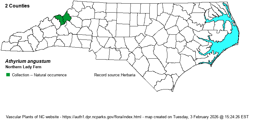 | Taxonomic Comments | Most references name this taxon as A. filix-femina var. angustum or ssp. angustum. Some older ones had it as A. filix-femina var. michauxii.