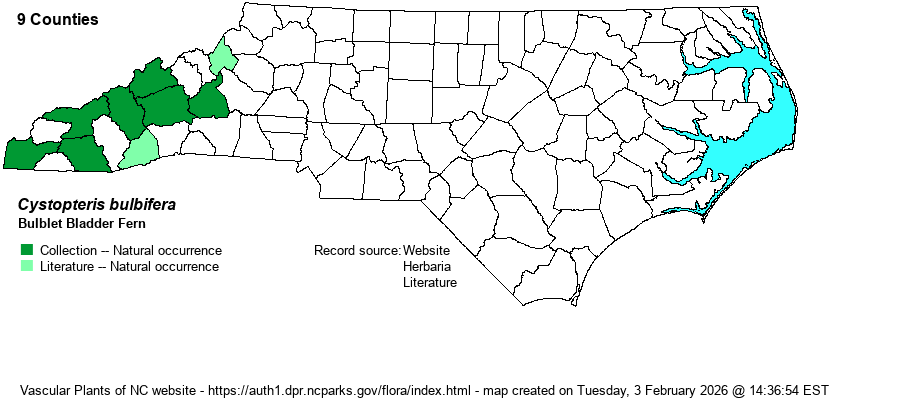 | Identification | This is one of the longest and narrowest (narrowly triangular shape) of the rock-inhabiting ferns in NC. The stipe is only about 6 inches long, much shorter than the blade, which is often 2 feet long and at times over 3 feet long, but barely 3-4 inches wide at the base. The blade is bipinnate-pinnatifid, and thus is quite finely cut and lacy-looking, with 20-40 pairs of pinnae. The lowest are opposite and narrowly triangular in shape, whereas the upper are very short, as the blade gradually tapers to a narrow apex. The sori are in cups (indusia) on the undersides of the pinnules, along the veins, and rounded in shape. This species has an odd habit of producing some bulblets (small pale green, globular masses) along the rachis and the top sides of some pinnae. If these bulblets are visible, it easily identifies the species; if not visible, the very long and narrowly triangular blade, growing on or next to calcareous rocks, should be sufficient for identification. | |