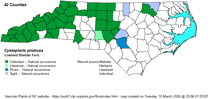 | Identification | This is a familiar fern of rich forests, especially in the Mountains. It is a somewhat small fern that grows in very dense stands. The stipes are glabrous and shorter than the blades, about 4-6 inches long, with the blades averaging 8-9 inches long and about 3 inches wide, somewhat ovate in general outline, widest toward the base but not at the base. The blades are bipinnate, and somewhat pinnatifid (the pinnules with some shallow lobing). As with others in the genus, the sori are in rounded cup-like indusia, located along veins on the undersides of the pinnules. C. fragilis is very similar (and often considered conspecific), but that species has the pinnae typically at right-angles to the rachis, versus pinnae angled upward in C. protrusa and often with the tip curved toward the apex as well; a narrower blade (3-4 times as long as wide) as opposed to 2-3 times as long as wide in C. protrusa; and sharp teeth on the pinnules as opposed to rounded lobes on pinnules in C. protrusa. Lastly, C. fragilis is a species growing on rocks, whereas most populations of C. protrusa grow in rich soil (but rarely on rocks). For separation from the possibly controversial C. tenuis, see that species account. | |