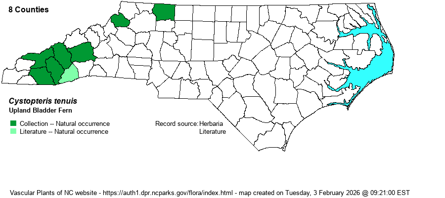 | Identification | This species is extremely similar to both C. protrusa and C. fragilis, all three occurring in the mountains of the state. This species has the ovate leaf blade of the quite common C. protrusa, with the bipinnate-pinnatifid shape. Weakley (2018) says that this species has leaves thicker in texture than the thin green leaves of C. protrusa (and C. fragilis); "basal pinnules slightly stalked or merely cuneate to the base; petiole dark brown; lowermost pinnules of each pinna slightly lobed; [often on rocks, less commonly on forest floor]" (Weakley 2018) for this species, versus "basal pinnules conspicuously stalked; petiole green to tan, darkened at base; lowermost pinnules of each pinna deeply cut; [typically on forest floor, less commonly on rocks]" (Weakley 2018) for C. protrusa. In general appearance, the pinnae look more densely packed with pinnules than in C. protrusa, owing to the stalked pinnules of that species carrying them off the "rachis" of the pinnae; plus the pinnules are barely lobed and thus more oval than the more deep sinuses in pinnules of C. protrusa. | |
