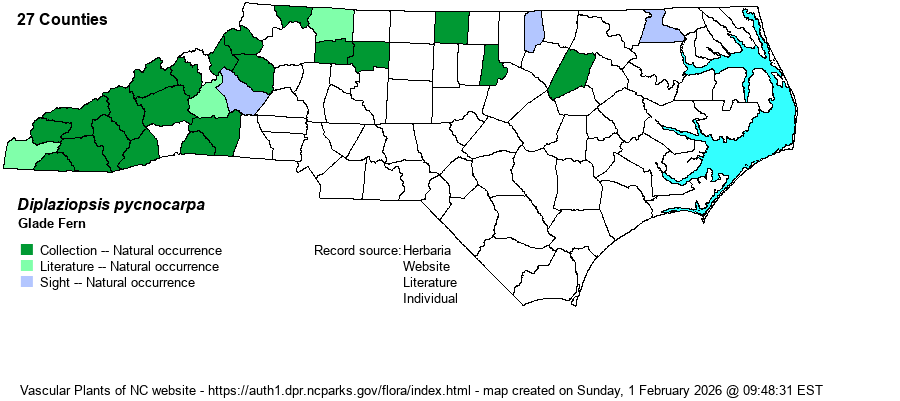 | Taxonomic Comments | This species has switched genera several times in recent decades. For much of the past century, it was awkwardly placed in the genus Athyrium (others there have more strongly dissected blades), as A. pycnocarpon. It has been moved to Diplazium (i.e., D. pycnocarpon) as well. Some current references have settled on Homalosorus, but with a slight change in the specific epithet (H. pycnocarpos).