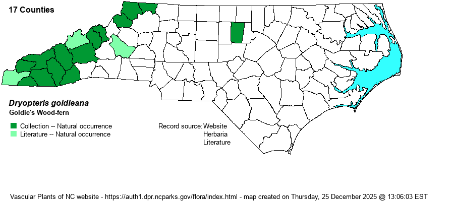 | Taxonomic Comments | Weakley (2018) notes that the correct spelling of the epithet is indeed "goldieana", and not "goldiana" as used in nearly all other references. As the fern is named after its discoverer, John Goldie, this indeed is the correct spelling.