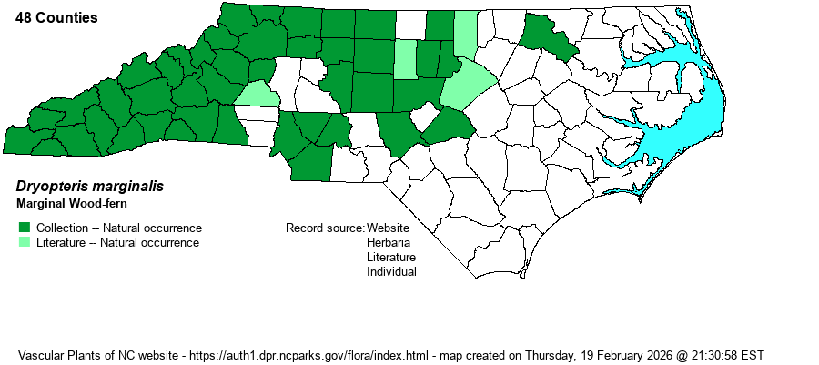 | Identification | This is a familiar montane fern of shaded and rocky places, especially on walks in fall, winter, or early spring, as it has evergreen fronds that lie on the ground or on rocks in the colder months. The stipe is about 6 inches long, with a much longer blade, lanceolate in shape and about 18-20 inches long and 6 inches wide. The thick and coriaceous blade is pinnate-pinnatifid, such that it is not a lacy-cut species like some other montane Dryopteris species such as D. intermedia and D. campyloptera. There are about 15-20 pairs of pinnae, each narrowly lanceolate to oblong and about 3 inches long. This species is readily separated from all similar ferns in that the rounded sori on the blade undersides are located along the pinnule margins, typically one sorus near each cut between pinnules; other Dryopteris species have paired sori along the pinnule midribs. | |
