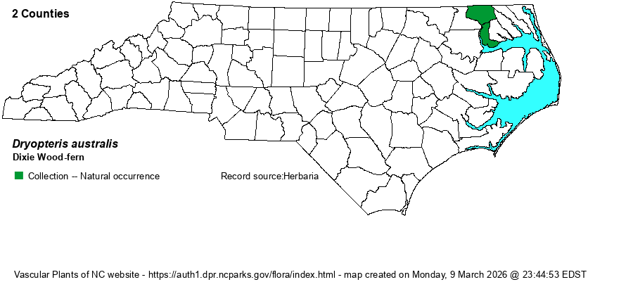 | Abundance | Very rare, known from apparently just two counites. However, as it has traditionally been named as Dryopteris x australis, perhaps few botanists bother to even look for the taxon. The State Rank of S1 from the NC NHP seems still appropriate; the website editors suggest at least a Watch List status. | |