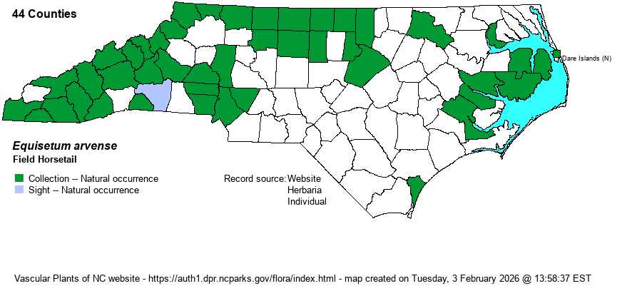 | Identification | This species has dimorphic stems. The sterile stalk is slender, quite heavily branched, and can grow to 2-3 feet tall, green in color. The branches are very slender, whorled, with many filamentous segments -- looking very bushy. The fertile stem is pinkish-flesh in color, unbranched, reaching only about 9 inches tall, and rather thick (to about 1/3-inch across). There are numerous nodes along the bare stem, at which grow numerous and narrow teeth on each sheath. The cone at the top of the fertile stem is about 3/4-inch long. This species looks similar to other species outside of NC, but completely different from the other native one, E. praeltum. The species is a familiar one in the mountains, but is less often encountered elsewhere than is E. praeltum. | |