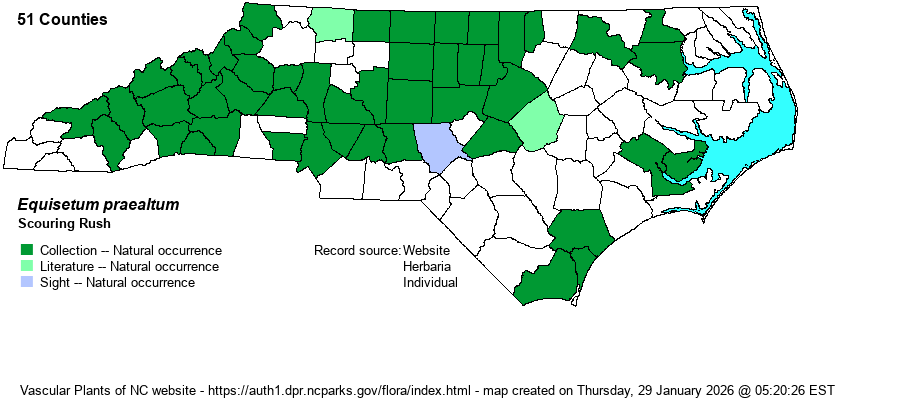 | Distribution | Throughout the Mountains and Piedmont; widely scattered over most of the Coastal Plain, but absent from the far eastern counties and some southern counties.