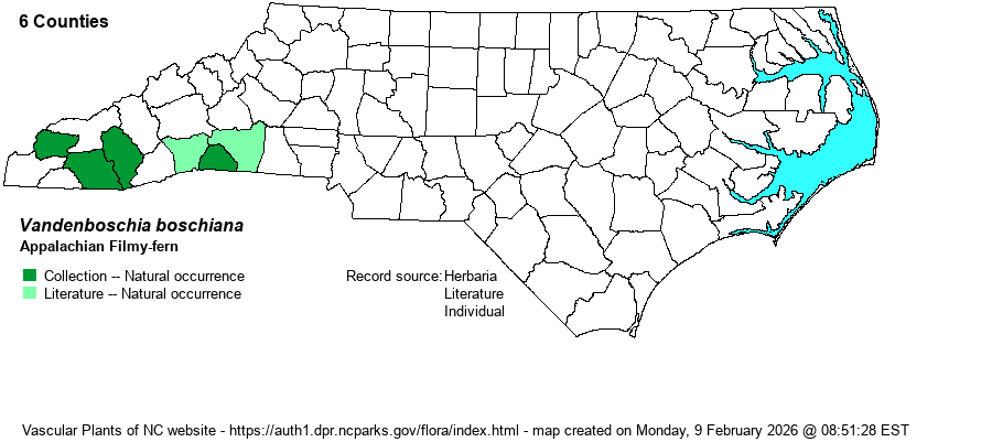 | Abundance | Quite rare and seemingly declining (or at least with very few recently documented sites), and despite records for six counties, the NCNHP has only seven records, only five still extant. Thus, it is the rarest of the four dwarf ferns (Hymenophyllaceae) in the state. It is a State Endangered species. | |