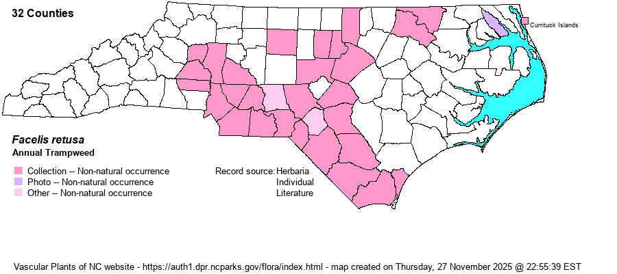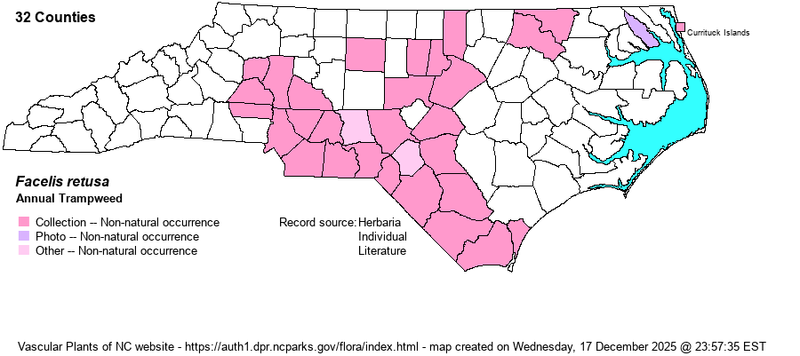 | Habitat | Dry sandy roadsides, gravel driveways, lawn weed, campus weed, cropfields, rocky river bluff (Stanly Co.). | |