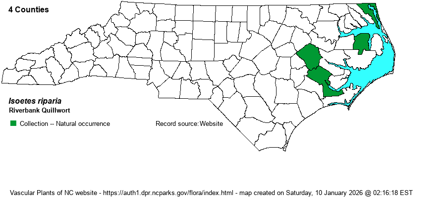 | Isoetes riparia | < | Isoetes riparia | Gleason and Cronquist (1991) | | | Isoetes riparia | < | Isoetes riparia | Flora of North America (1993b, 1997, 2000, 2002a, 2002b, 2003a, 2004b, 2005, 2006a, 2006b, 2006c, 2007a, 2009, 2010) | | | Isoetes riparia | < | Isoetes riparia | | | | Isoetes riparia | < | Isoetes riparia | Radford, Ahles, and Bell (1968) | | | Isoetes riparia | < | Isoetes riparia | Flora of Virginia | (also see I. saccharata) | | Isoetes riparia | > | Isoetes riparia var. riparia | Gleason (1952) | | | Isoetes riparia | > | Isoetes riparia var. riparia | Kartesz (1999) | | | Isoetes riparia | > | Isoetes riparia var. amesii | Gleason (1952) | | | Isoetes riparia | > | Isoetes riparia var. amesii | Kartesz (1999) | | | Isoetes riparia | > | Isoetes riparia var. robbinsii | Gleason (1952) | | | Isoetes riparia | > | Isoetes riparia var. reticulata | Gleason (1952) | | | Source: Weakley's Flora |