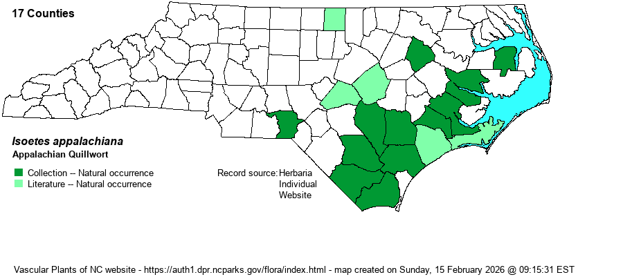 | Distribution | This is a fairly newly described species (Brunton & Britton 1997). It is scattered over most of the Coastal Plain, though scarce in the northern portion. A few records for the eastern Piedmont: Richmond County (ID verified) and perhaps Wake County (needs ID). Mountains records are probably all I. engelmannii sensu stricto. We have mapped only those specimens that were mapped by Brunton & Britton (1997) as I. appalachiana or that were annotated by C.F. Reed in 1961 as I. engelmannii var. georgiana. However, most species of this cryptic genus are under-collected, and thus the range should be more widespread than shown on our map. Records from NCNHP (light green) need vetting.