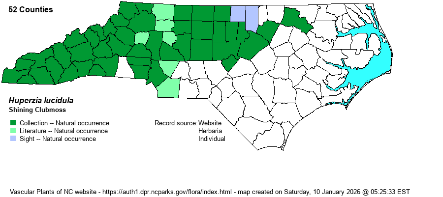 | Other Common Name(s) | Shining Firmoss. When this and other Huperzia species were included within the large genus Lycopodium, most species had common names of "xxxxx Clubmoss". With some of them split out into Huperzia, there is a trend to call these species as "xxxxx Firmoss". Most references still use Shining Clubmoss as the preferred common name. | |