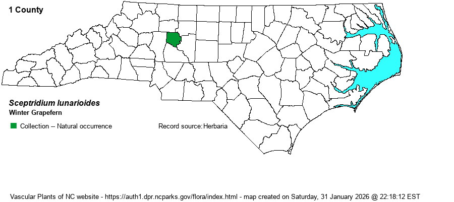 | Identification | Weakley (2018) notes that "This species is hard to spot, and all the more difficult to find because of its phenology; the leaves appear in late fall and die by early spring." This is a small and quite odd fern, not only in its short stature but the fact that the sterile leaf is prostrate on the ground. As Weakley (2018) implies, the blade is "evergreen" -- green during the winter but withering in spring. This blade is deltoid to triangular, 2-3 inches long, 3-4 inches wide, tripinnate, but with the ultimate pinnules rounded. The fertile blade is bipinnate but bead-like, raised above the ground on a stalk about 1-2 inches tall. The visual aspect of the entire plant is reminiscent of a basal rosette of a dicot with compound leaves and rounded leaflets! In fact, it would be passed over as a dicot unless you see the bead-like clusters (fertile blade) at the top of the stem. | |