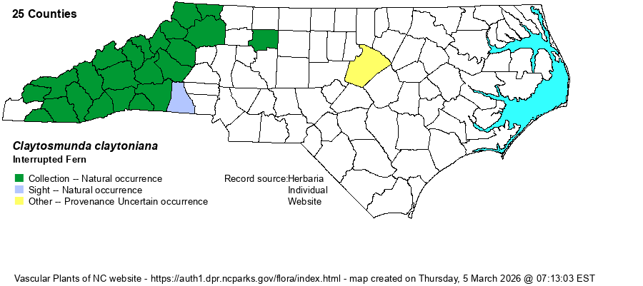 | Habitat | This species favors mesic montane forests, usually on slopes and usually in full to partial shade. It may grow in damp and loamy ground along floodplains, but most populations are at middle to high elevations in oak-hickory forests, balds, edges of high elevation forests, and other places away from cove forests, where it is scarce. Despite its great array of elevations and moisture conditions, it is not as common as one might expect, clearly less common than the closely related Osmundastrum cinnamomeum. | |