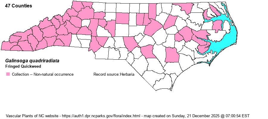 | Identification | The 2 species of Galinsoga have heads like tiny daisies -- yellow disk and short white rays. The leaves are opposite, on short stalks, mostly ovate, the margins toothed. G. quadriradiata has longer ray florets (2-3 mm long vs. usually less than 1.5 mm and a maximum of 2 mm long in G. parviflora), plus other characters -- see the Weakley (2018) key. | |