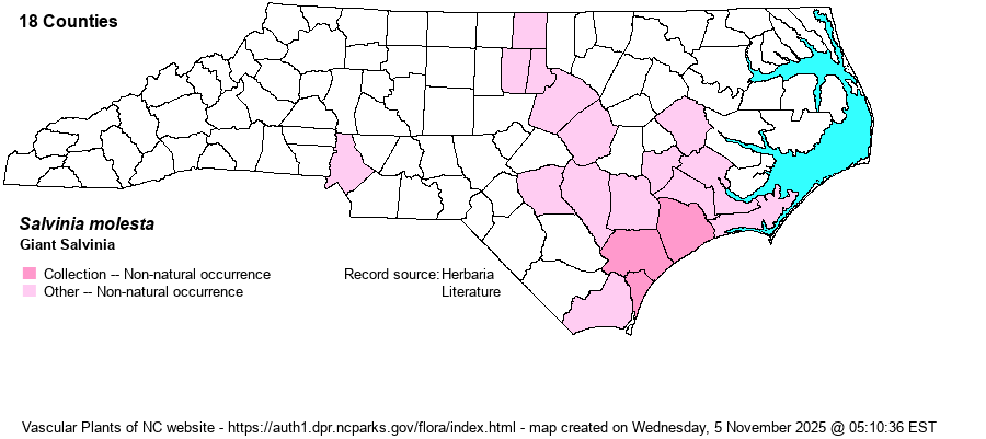 | Abundance | Apparently well-established in NC, but colonies are being destroyed as they are found. It is a federal noxious weed species. As recently as 1993, FNA only mentions that this aggressive alien "represents a candidate for escape." | |
