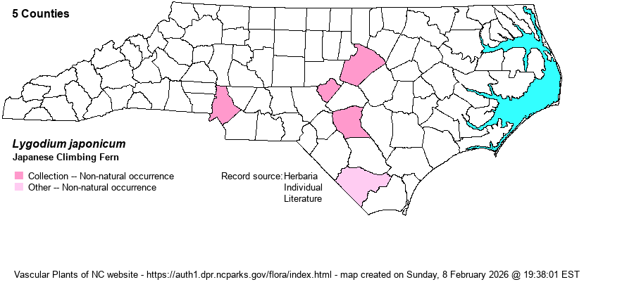 | Identification | Like our native Lygodium palmatum, Japanese Climbing-fern produces very long leaves that seem to be stem branches. These may grow 3-20 feet (or more) and twine around supporting vegetation or structures. They bear pinnately to palmately lobed leaflets that do not resemble a hand (unlike our native species). | |