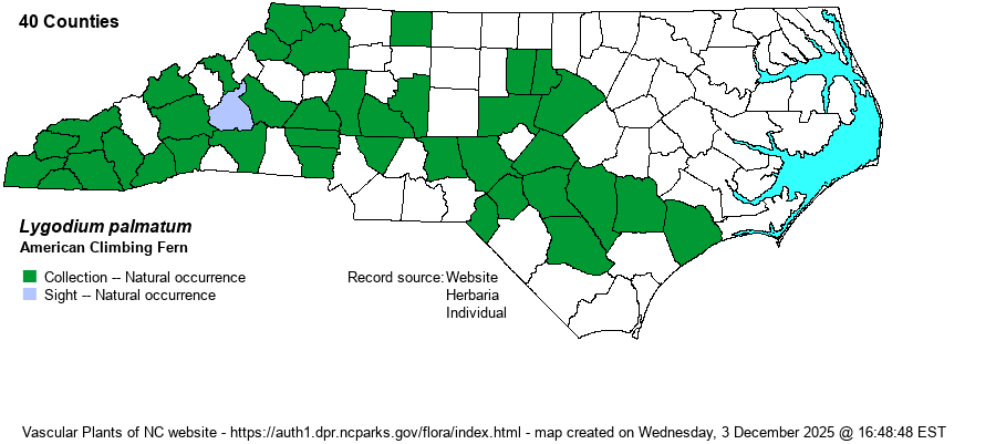 | Identification | This is the only native fern that has a twining, vinelike stem, familiar to most biologists and many laypersons. The "frond" can be 8-9 feet long, and the "leaves", which are actually pinnae, are scattered along the rachis. The sterile pinnae (green in color) are palmately lobed, very much looking like a small hand with 5-7 slender and rounded lobes, and about 1.5-2 inches long and across. The pinnae at the end of the frond are the fertile ones, much smaller but still hand-like and green in color. The plants are usually seen in small colonies of tangled masses, climbing on other plants or trailing along the ground. The other NC member of the genus -- L. japonicum -- is an exotic species, with pinnately compound fronds, looking somewhat like some native ferns except for its vine-like habit. | |