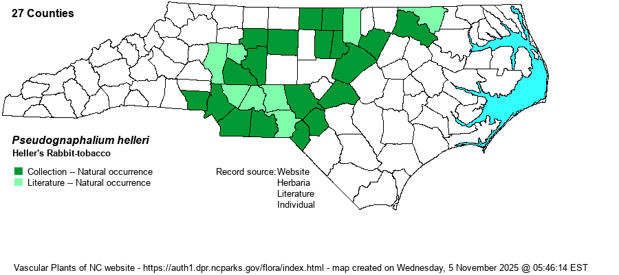 | Taxonomic Comments | In older texts, treated as Gnaphalium helleri. Many to most references did not, or do not, consider this and Delicate Rabbit-tobacco to be distinct species. Early references had them lumped, whereas many have them only as varieties.
