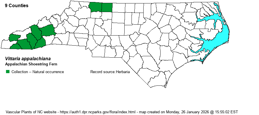 | Identification | This is a gametophytic species, "reproducing vegetatively by gemmae, having lost the capability of producing sporophytes" (Weakley 2018). It has the appearance of a liverwort, with a branched pattern of tape-like green strips, one cell thick. "Dense colonies of Vittaria appalachiana coat rock surfaces in deeply sheltered habitats" (Flora of North America website). For a more detailed description, see the species account on that website. | |