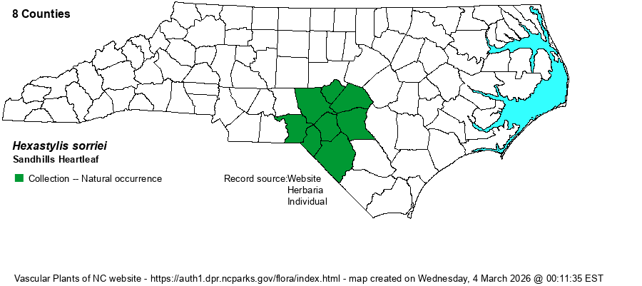 | Identification | This species had previously been identified as either Hexastylis minor or H. virginica, prior to being described in 2011. Biologists felt that these two species, especially H. minor, seemed out of character and habitat in its sandy and relatively flat, blackwater habitat of pocosin margins, instead of rocky bluffs and slopes in the Piedmont. Thankfully, this new species description seems to end this confusion and mystery. This new species has similar round, glossy, green to dark green, and evergreen leaves as nearly all others in the genus, with the leaves about 3 across across and wide and with a cordate base. However, this species has only a light green mottling along the veins (or occasionally unmottled), typically less striking than the white veining pattern found on most leaves of these other two species. Otherwise, the flowers resemble H. minor -- brown on the outside of the calyx cup, and with spreading lobes. However, H. sorriei has these lobes only 1/5-inch long, much shorter than those of H. minor, and the calyx tube/cup is usually about 1/2-inch long or high, as opposed to about 2/3-inch in H. minor. These flower characters are rather slight, but the distinctly different habitats -- H. minor is essentially limited to the Piedmont and found on rocky or often dry slopes, as opposed to semi-wetland habitats in the Sandhills -- should separate the two. Leaf coloration should also be helpful, as well, but always use this with caution, and it is a good idea to see a number of plants or several populations to be reasonably sure of the identification. Thankfully, for people attempting to see this localized plant, there is much public land on the Sandhills Game Land and at Weymouth Woods Sandhills Nature Preserve to walk the outside of streamheads and look for this species. | |