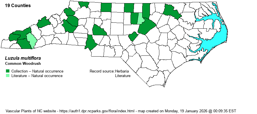 | Abundance | Uncommon to infrequent; not as well known as the other 3 species of Luzula in the state. This is, surprisingly, considered as a Watch List species by the NCNHP; the editors suggest a revised State Rank down to S3?, as opposed to a rarer S2?. | |
