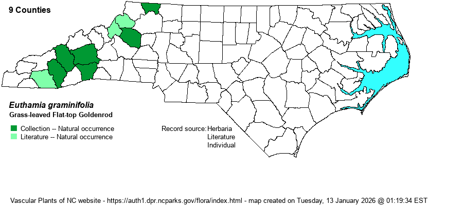 | Identification | Our species of flat-topped goldenrods can be told from other goldenrods (genus Solidago) by their generally flat-topped inflorescences and by their slender stem leaves that tend to be all about the same size on a given plant. This species grows 2-3.5 feet tall and has leaves with 3-5 obvious main veins and is the only Euthamia in the NC mountains. | |