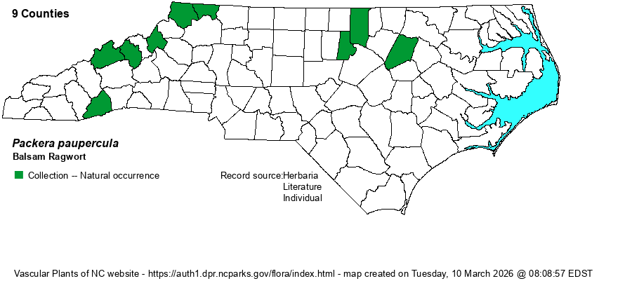 | Taxonomic Comments | The former Senecio pauperculus has been moved to Packera paupercula, but has been split out into two species -- Packera crawfordii and P. paupercula (see Weakley [2018]). Some references split it into two varieties -- var. appalachiana and var. paupercula.