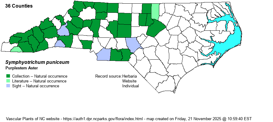 | Identification | Purplestem Aster is robust, up to 7 feet tall, usually several stems together that are red-purple in color. Stems are coarsely hairy (sometimes only hairy in narrow lines). Leaves are lance-shaped to elliptic, stalkless and clasping, sparsely toothed, rough above, 4-7 inches long, and only slightly reduced in size up the stem. Inflorescences are wide-branching, with large heads of lavender-blue to purplish rays and yellow disks. Elliott's Aster (S. elliottii) is similar but occurs only on the outer Coastal Plain; it has glabrous stems and non-clasping leaves, and its flowers are generally pink to pink-lavender and not blue-colored. | |