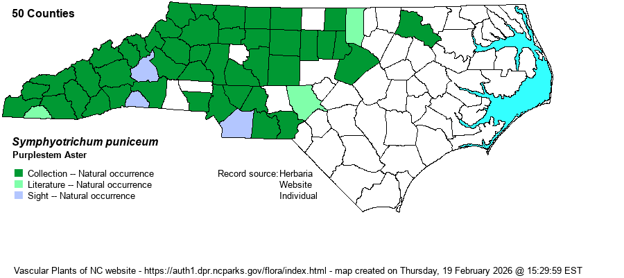 | Identification | Purplestem Aster is robust, up to 7 feet tall, usually several stems together that are red-purple in color. Stems are coarsely hairy (sometimes only hairy in narrow lines). Leaves are lance-shaped to elliptic, stalkless and clasping, sparsely toothed, rough above, 4-7 inches long, and only slightly reduced in size up the stem. Inflorescences are wide-branching, with large heads of lavender-blue to light purplish rays and yellow disks. Elliott's Aster (S. elliottii) is similar but occurs only on the outer Coastal Plain; it has glabrous stems and non-clasping leaves, and its flowers are generally pink to pink-lavender and not blue-colored. | |
