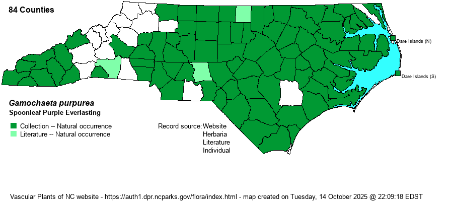 Identification | The original Spoonleaf Purple Everlasting has been split into several species, some native and some alien; see the key in Weakley (2018). As now understood, this species occurs in a number of natural habitats, as well as ruderal ones, whereas the segregates occur almost entirely in ruderal and disturbed habitats. Spoonleaf Purple Everlasting belongs to the group that has bicolored leaves: the upper surface is green while the underside is whitened with dense hairs. Note that some plants will have basal and lower leaves essentially green above and stem leaves practically whitened on both surfaces; these will not key cleanly. The species differs from G. argyrinea in its narrower leaves that are spatulate (vs. oblanceolate or obovate) and taller involucres (4-4.5 mm long vs. 3-3.5 mm long). | |