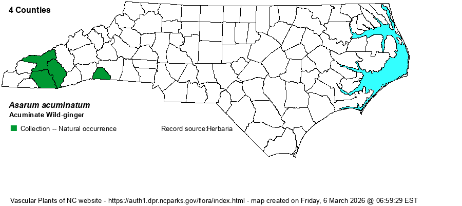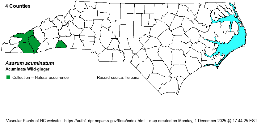 | Distribution | This is a controversial recent split from A. canadense; A. reflexum was also split out at the same time. All three taxa occur in the state, but A. acuminatum is believed to be very rare to rare -- Weakley's (2024) map shows it as "rare" -- and found only in the Mountains and foothills. Only four collection records are known in NC at the present time, though certainly it must occur elsewhere in the western part of the state.