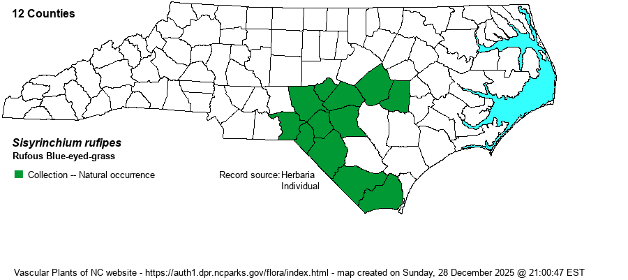 | Distribution | Limited in the state to the Sandhills region, plus extensions of this range to the east to Wayne County and southeast to Brunswick County. Note that this is generally the western portion of the range of Sisyrinchium arenicola as shown on the range map in RAB (1968). Specimens at NCU and elsewhere have been annotated by Sorrie.