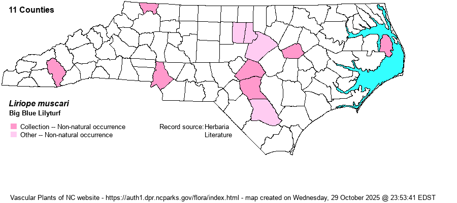 | Identification | Lilyturf grows as colonies of dark green, narrow leaves that begin straight but become arched over. The flowering stems are erect, with a dense spike of small, lavender, ball-like flowers. | |