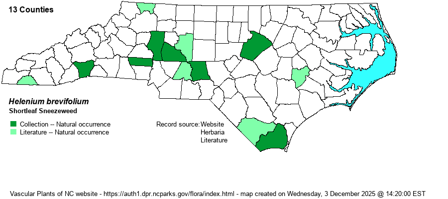 | Identification | Three of our species of sneezeweed (Helenium) bloom in mid-late spring, have well-developed basal leaves but few and small stem leaves, and can be testy to tell apart without attention to details. Leaves of Southeastern Sneezeweed (H. pinnatifidum) are not decurrent on the stem or at most 5 mm (there is no continuation of leaf tissue as a "wing" down the stem). In Shortleaf Sneezeweed, the stem just below the head is generally densely pubescent (vs. glabrate in Savanna Sneezeweed [H. vernale]). Note that these other two species are strictly lower Coastal Plain species, and only a few populations in the range of this species overlap them. The similar Purplehead Sneezeweed (H. flexuosum) blooms into summer, but it has numerous flowering heads (more than 5), whereas this species has only 1-5 flower heads. | |