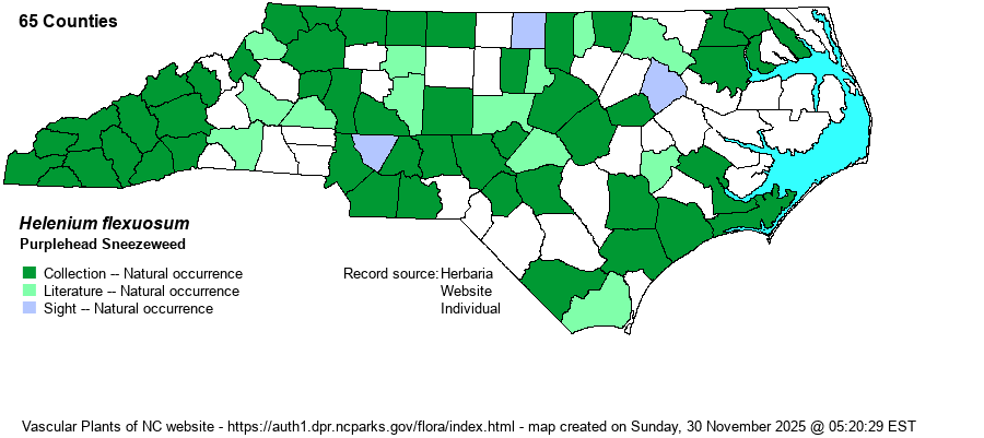 | Abundance | Generally infrequent, to locally fairly common, statewide. The many gaps are due to it not being a common species of sneezeweed (Helenium). Nonetheless, as it has been collected from nearly half of the state's counties, and all across the state, the editors suggest a State Rank of [S4S5] as opposed to S4. | |