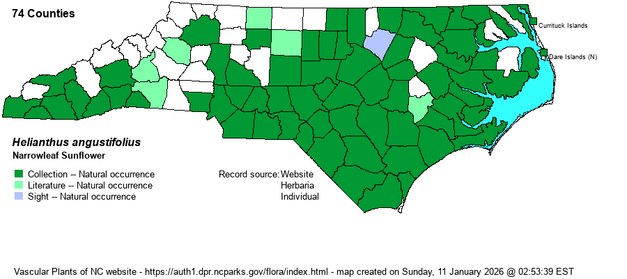 | Identification | Plants grow 3-6 feet tall, with numerous, slender (1/3-inch wide and 5-7 inches long), scabrous (rough to touch), opposite, dark green leaves (often with revolute margins -- making them look even narrower). The inflorescence is broad and multi-branched; the numerous heads are about 1.5-2 inches across, with bright yellow rays and brown-purple disks. The slender leaves are not likely to be confused with other sunflowers. This is a very striking plant when in bloom. | |