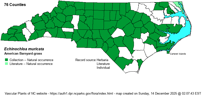 | Identification | From the familiar, exotic Common Barnyard-grass (E. crusgalli), this native species must be identified with care. It differs in having papillose-based (like pimples) hairs on second glumes and sterile lemmas (vs. hairy or scabrous, but not papillose-based in E. crusgalli). In addition, the fertile lemma has a relatively thick, spiny tip that is persistent (vs. thin and deciduous and set off from the body by a line of tiny hairs in the exotic species). | |