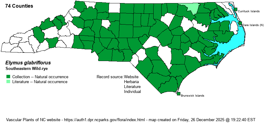 | Identification | This is a wild-rye of average height and dimensions. It has recently been split off from E. virginicus. From E. virginicus, it is told by wider inflorescences (including the awns, from 2.2-4.5 cm wide vs. 0.7-2.2 cm wide in E. virginicus) and glume awns that are 10-30 mm long (vs. 0-10 mm long). | |