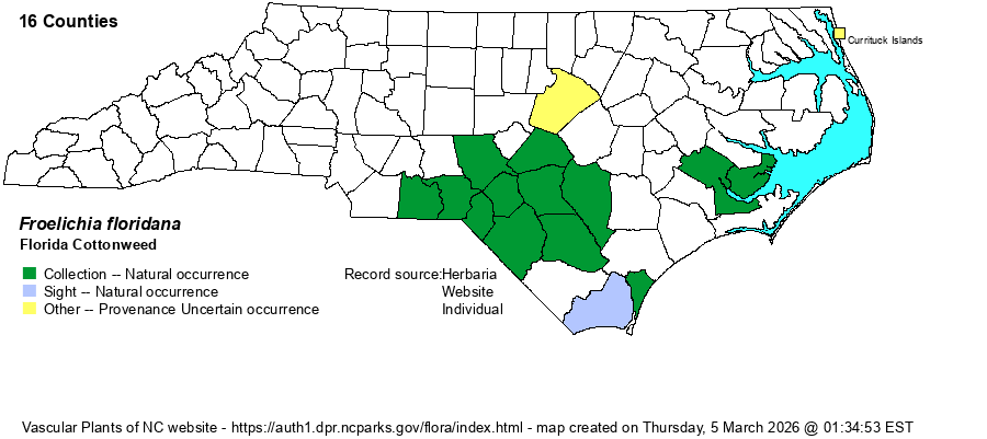 | Abundance | Frequent to common, and locally abundant in the Sandhills; uncommon to locally common east to Sampson and Bladen counties, but rare near the coast. Can be a visually dominant forb in some abandoned sandy fields in the Sandhills. The editors suggest a State Rank of S4, instead of the NCNHP's S3?. | |