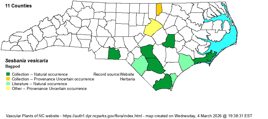 | Taxonomic Comments | Many or most references, at least several decades ago, named this species as Glottidium vesicarium. There seems to be near universal agreement that it belongs now in the genus Sesbania.