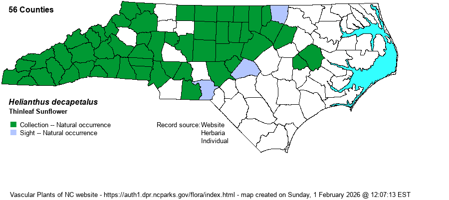| Abundance | Fairly common in the Mountains and Piedmont; extremely rare into the central Coastal Plain. | |