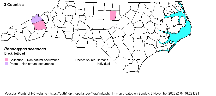 | Identification | Black Jetbead indeed has jet-black, shiny berries. It is a shrub to about 6-7 feet tall, the branches ascending. Leaves are opposite, ovate, taper-pointed, and prominently veined; they look much like the leaves of Viburnum dentatum var. lucidum. Flowers are white, with 4 broad petals. | |