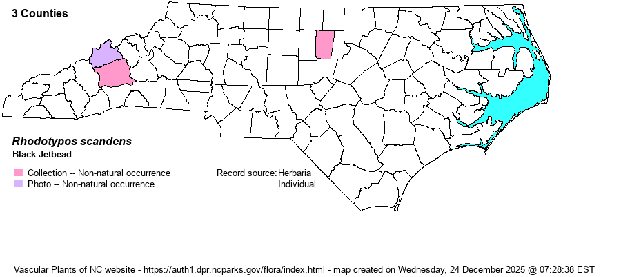 | Distribution | Found outside of cultivation in 3 counties: Buncombe, ravine south of Biltmore House; Madison, on logging road; and Orange, stream bank in Battle Park.